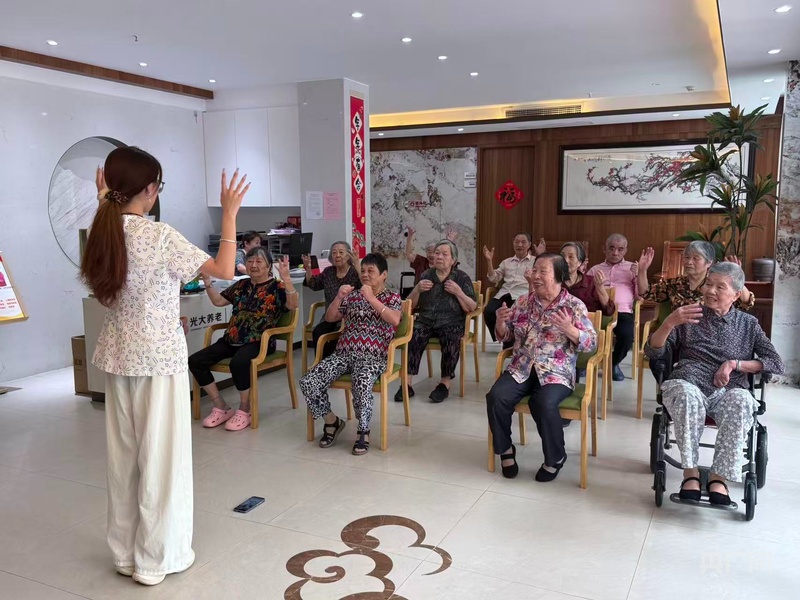 在元墅西兴老人公寓,工作人员组织老人做手指操(央广网发 受访者供图)
