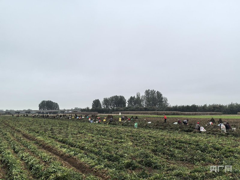 南阳市社旗县李店镇的花生田里,村民人工薅花生(央广网发 李田园 摄)