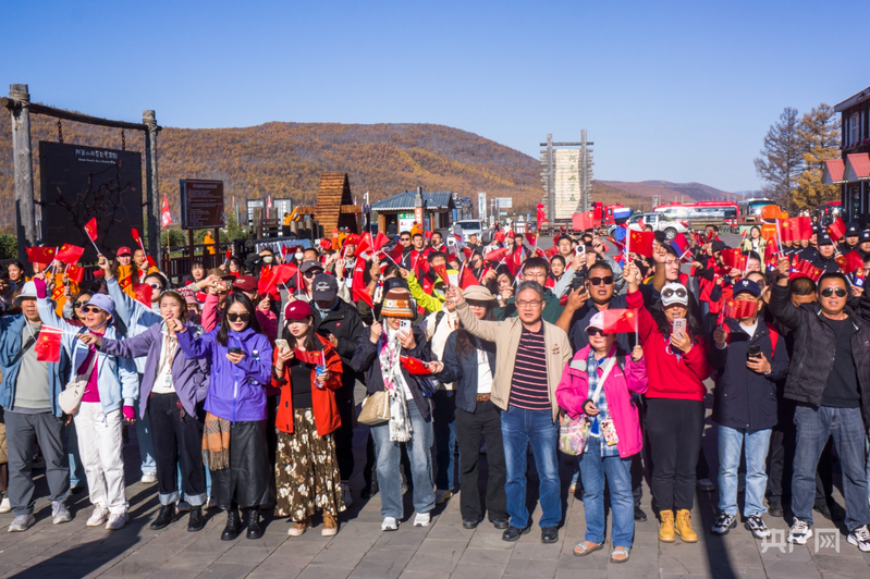 各地游客在阿尔山国家森林公园挥舞国旗(阿尔山市委宣传部供图)
