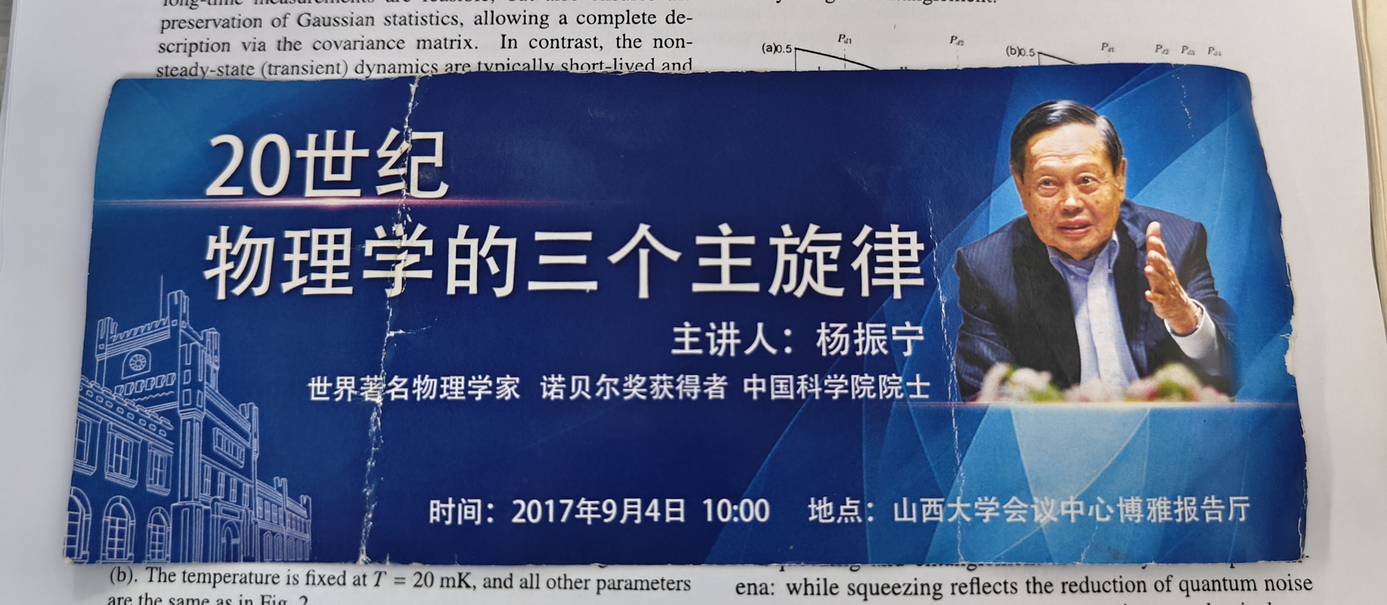 央广网太原10月23日消息(记者张洁)2025年10月18日,享誉世界的物理学家、诺贝尔物理学奖获得者,中国科学院院士杨振宁先生逝世。“巨星陨落,光辉永存!”山西大学物理电子工程学院老师郭奇,当天发了这样一条朋友圈,并附上2017年他参加杨振宁先生在山西大学讲座的入场券和现场照片,以此追忆缅怀。1992年、2017年,杨振宁先生两度应邀来访山西大学,为学校师生们讲座,并写下“宁拙毋巧,宁朴毋华”的寄语。近日,记者走进杨先生到访过的地方,从山大师生的回忆中“寻找”一代物理学巨擘的身影。