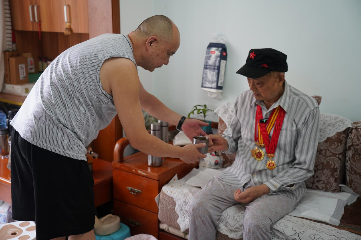 廖勇倒水给廖仁江喝(央广网发 王昶文 摄)