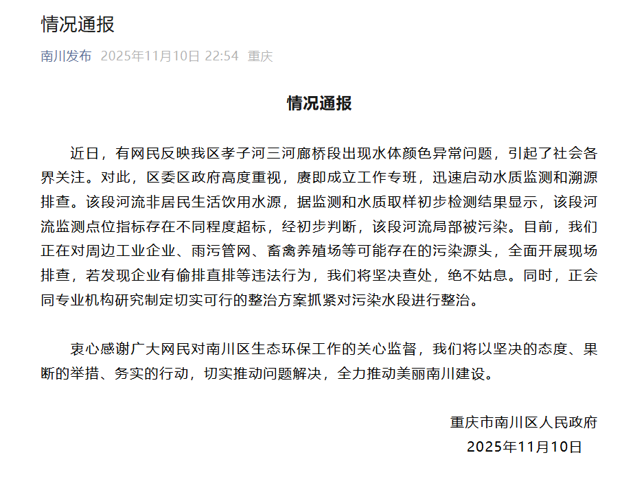 央广网重庆11月11日消息(记者陈静)11月10日晚,重庆市南川区人民政府发布情况通报:近日,有网民反映该区孝子河三河廊桥段出现水体颜色异常问题,引起了社会各界关注。对此,区委区政府高度重视,赓即成立工作专班,迅速启动水质监测和溯源排查。