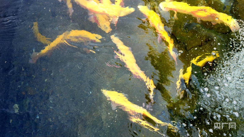 温宿县鹏博渔业开发有限公司负责人施泽鹏在查看鱼的生长情况 (央广网记者姜茸 制图)