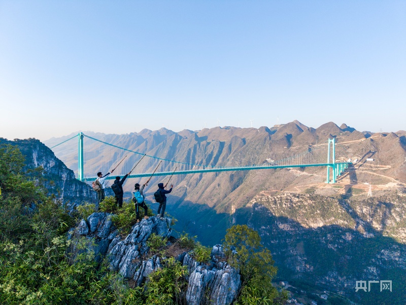 游客穿着专业的户外装束,与花江峡谷大桥合影(央广网发 潘小虎 摄)