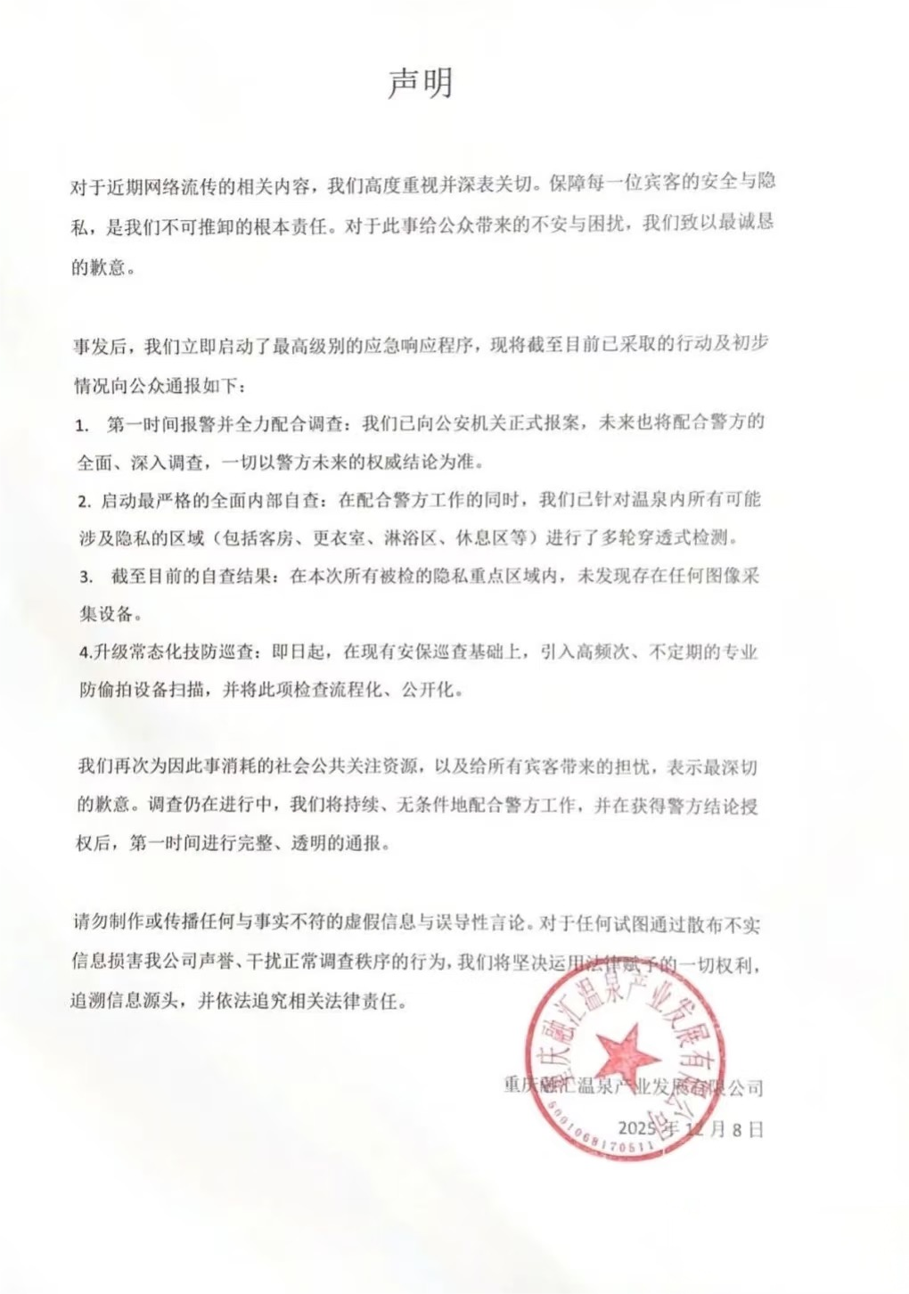 12月8日下午,重庆融汇温泉产业发展有限公司发布声明回应称,已第一时间向公安机关报案,并针对客房、更衣室、淋浴区等隐私区域开展“穿透式检测”,未发现图像采集设备。公司同时宣布,将升级安保措施,引入高频次、不定期的防偷拍设备扫描,并将检查流程公开化。