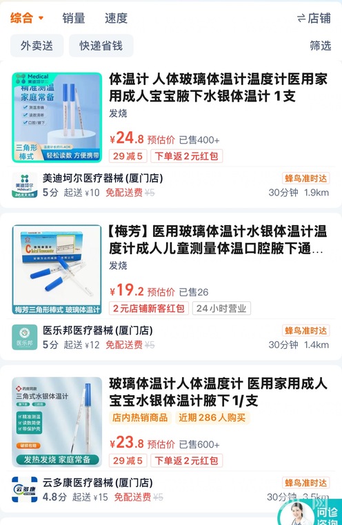 记者通过实地走访与线上查询对比发现,不同销售渠道的水银体温计价格差异显著。在外卖平台检索厦门区域的药店,一根水银体温计的售价已普遍涨到10-25元区间,部分标价甚至达到29元,较此前常规价格(3-5元)涨幅超3倍。而线下走访时,价格则相对平稳,康佰家大药房、鹭燕大药房等连锁品牌的标价基本维持在8-10元,部分本地小型药店因进货渠道不同,标价为7-9元,但约四成受访门店明确表示“已断货”。