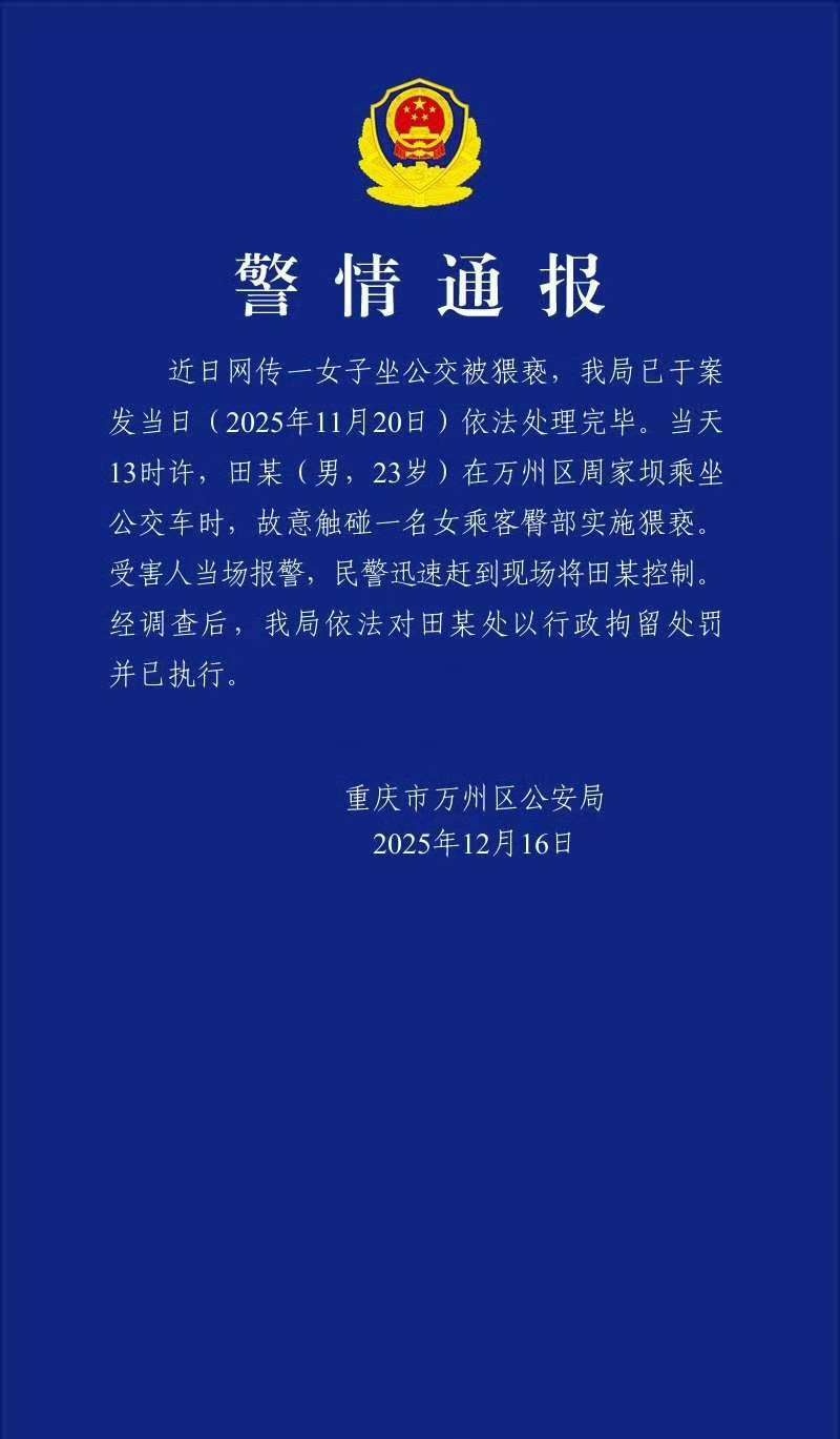 央广网重庆12月16日消息(记者王海 实习记者贾洛芸)12月16日,重庆市万州区公安局发布警情通报,网传“公交猥亵”事件涉案男子已被警方依法处以行政拘留。