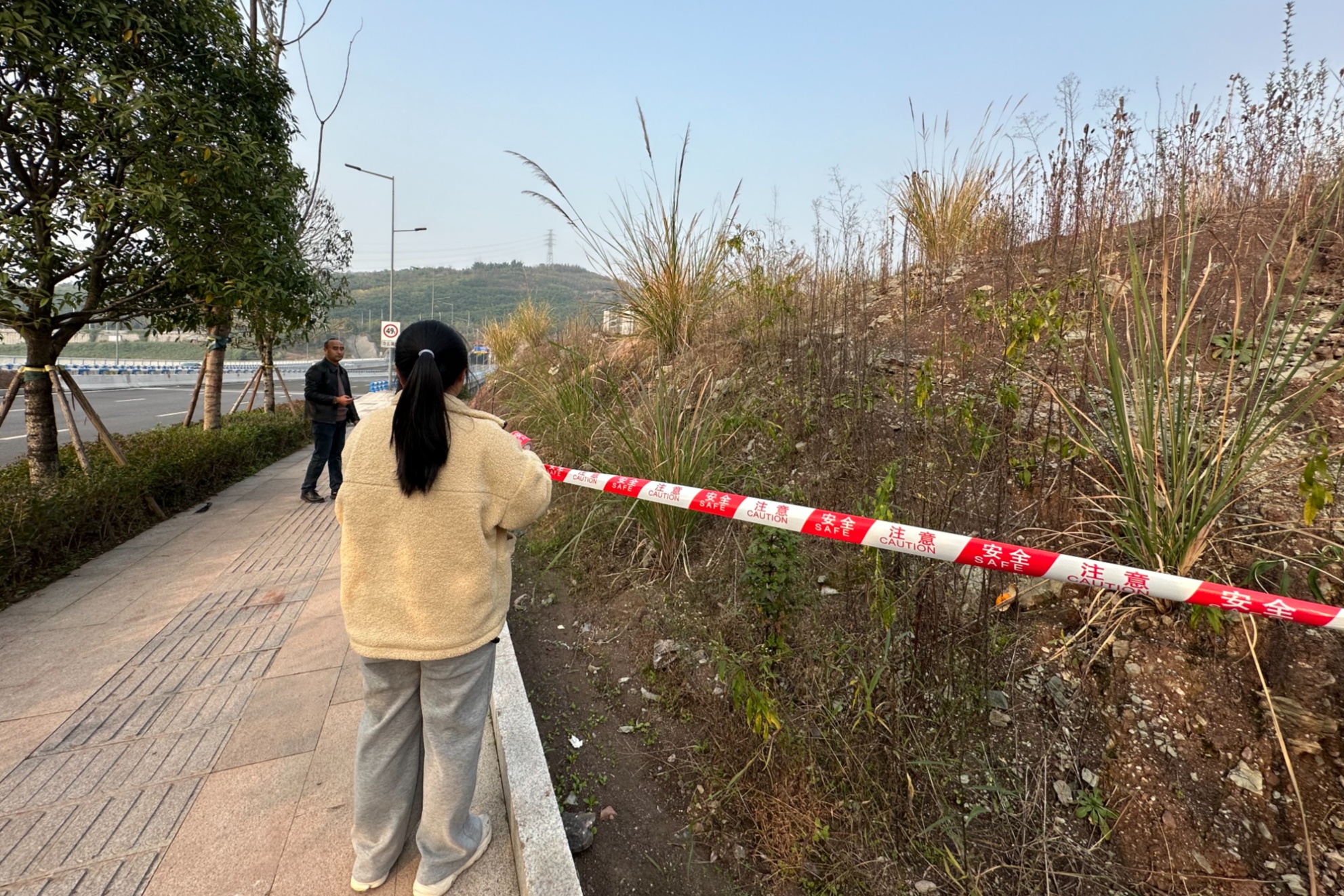 下午三点多,重庆两江新区相关部门工作人员张先生带领人员来到现场,在公路对面的上山通道处新增设了警戒线。“上面坡陡,安全隐患不得不防。”张先生一边设置围挡,一边向试图上山的市民发出提醒。他介绍道,这处山坡的地质结构比较松散,又缺乏专门的安全防护设施,对前来活动的市民来说,安全风险相对较高。另一方面,山坡紧邻公路,挖掘活动会对周边地质环境造成一定影响,还容易引发滑坡或碎石滚落,给过往车辆和行人也带来安全隐患。