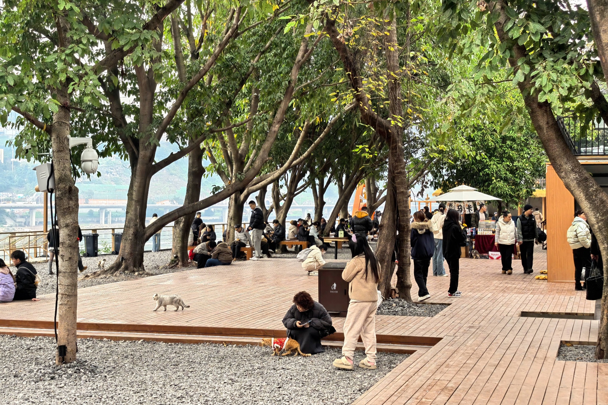 漫步乐园,园区内草坪开阔整洁,多层级观景台依江而建,错落分布的休闲座椅上,不时有游客驻足歇脚、畅谈,并与身旁的流浪猫亲密互动。