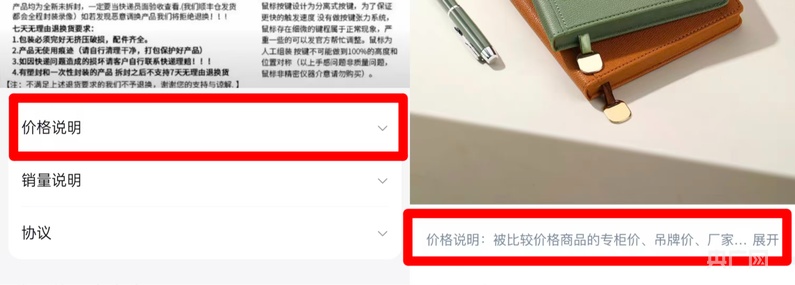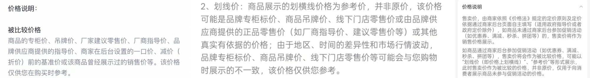 “虽然很难直接认定该行为属于价格欺诈,但将价格说明置于商品详情页底部,远离核心价格区域,甚至将其折叠,导致多数消费者忽略该说明,属于未完整履行信息披露义务。” 张江进一步指出,平台划线价仅标注 “吊牌、厂家建议价、包装” 等宽泛的来源范围,未明确具体定价依据,导致消费者无法核实价格合理性,仍可能被“高参考价”营造的优惠假象误导,这同样属于信息披露不充分。她表示,平台必须明确划线价的具体来源,这是保障消费者知情权的法定必要义务。