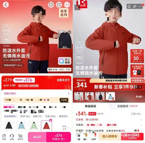 想着最近各大平台都有新年促销活动,他又打开其他电商平台,对比是否有更优惠的价格,结果发现同款外套在另一电商平台的标注价格截然不同——划线价379元。