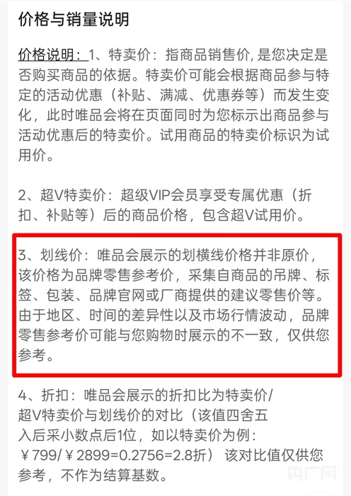 什么是划线价?根据吴先生反映的情况,记者查询发现,该平台几乎每一件商品详情页的最下方,都有标注“价格说明”。其中,对于划线价的描述为:“唯品会所展示的划线价格并非原价,该价格为品牌零售参考价,采集自商品的吊牌、标签、包装、品牌官网或厂家提供的建议零售价等。由于地区、时间的差异性以及市场行情波动,品牌零售参考价可能与您购物时展示的不一致,仅供您参考。”