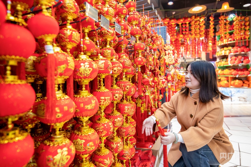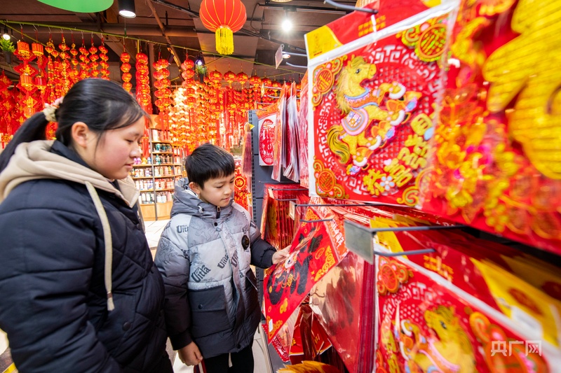 央广网黔东南1月25日消息(记者杨贇)随着春节临近,年味渐浓,贵州省黔东南苗族侗族自治州从江县的各大年货市场热闹起来。红彤彤的灯笼、春联、福字挂满货架,形态各异的新春饰品琳琅满目,从寓意吉祥的中国结到精致可爱的生肖挂件,应有尽有。市民穿梭在各个货架前,精心挑选心仪的新春饰品和年货,用满满的仪式感装点生活,共同期待新春佳节的到来。