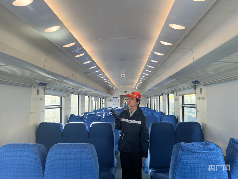 郑州车辆段质检员杨君正在对车上服务设施进行检查(央广网记者 夏莎 摄)