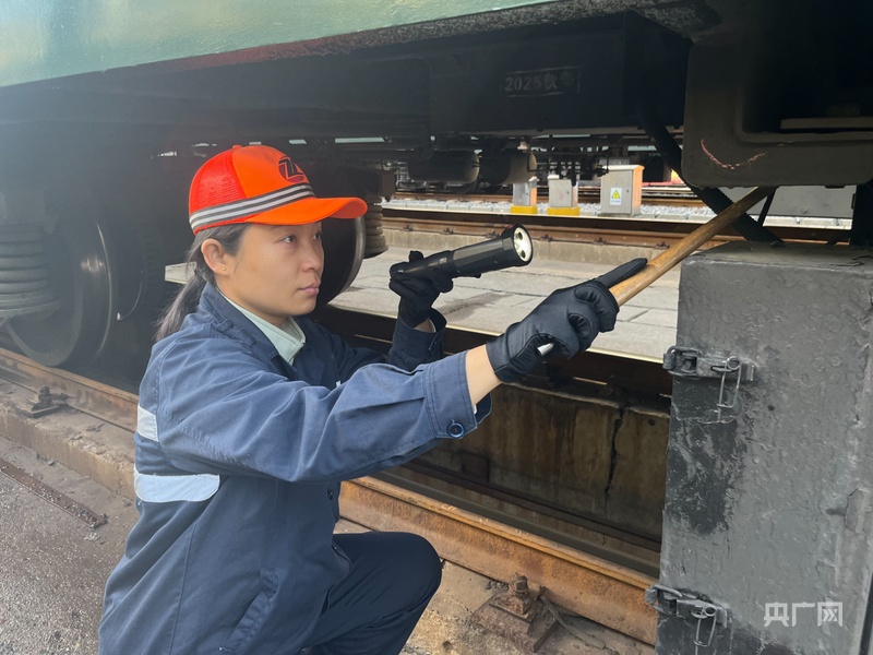 郑州车辆段质检员杨君在对车辆走行部进行检查(央广网发 于杰 摄)