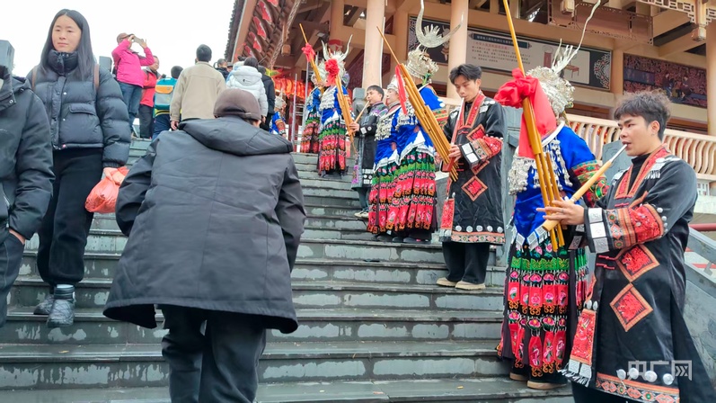 苗族青年男女吹响芦笙、跳起舞蹈,欢迎客人(央广网发 范碧琴 摄)