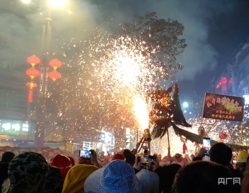 “嘘花越旺,福气越旺!”“雄起、雄起、雄起!”围观人群热情高涨,手中的嘘花筒不停喷射,大家追着龙灯跑、跟着队伍欢,尖叫声、喝彩声此起彼伏。