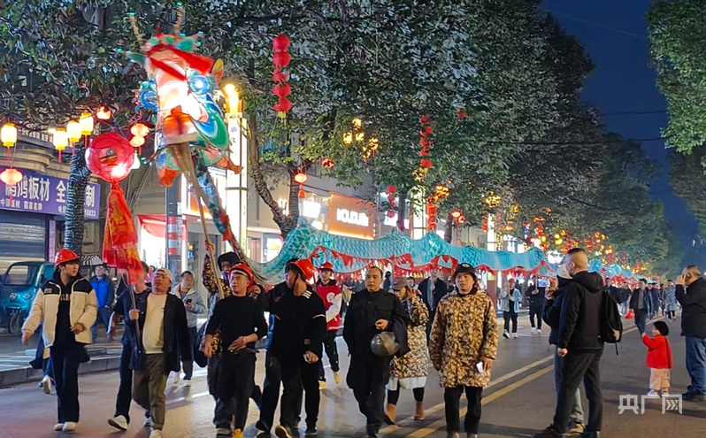 酒过三巡,天色已完全暗透。县城主干道的灯火亮了起来,人群开始向街巷涌动,等待当天重头戏“舞龙嘘花”活动的开始。