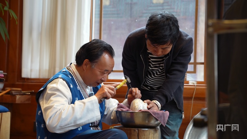 云南省大理州鹤庆县草海镇,一声声清脆的敲打声,从白墙青瓦间传出。年轻的学徒们专注錾刻,锤起锤落间,银光闪动。每一天,小镇就是在这样的声响中醒来。