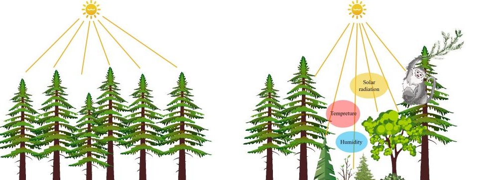 没有滇金丝猴的区域,林窗较小,植物群落单一(左图);滇金丝猴活动的区域,因其取食等行为折断林冠树枝,增大林窗,改变林下气候条件,增加了生物多样性且优化了森林结构(右图)。(绘图者 李娜)