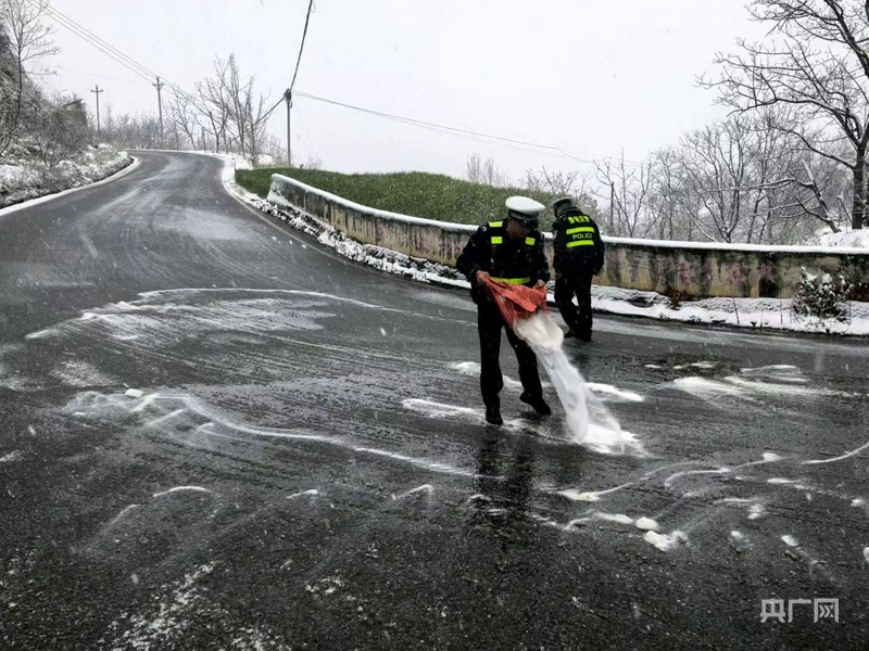 雨雪天气下,交管部门处理路面积雪(央广网发 来源:云南省公安厅)