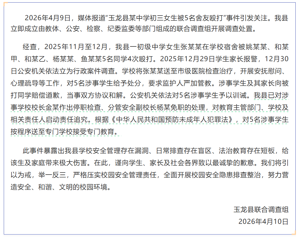 具体通报如下:2026年4月9日,媒体报道“玉龙县某中学初三女生被5名舍友殴打”事件引发关注。我县立即成立由教体、公安、检察、纪委监委等部门组成的联合调查组开展调查处置。