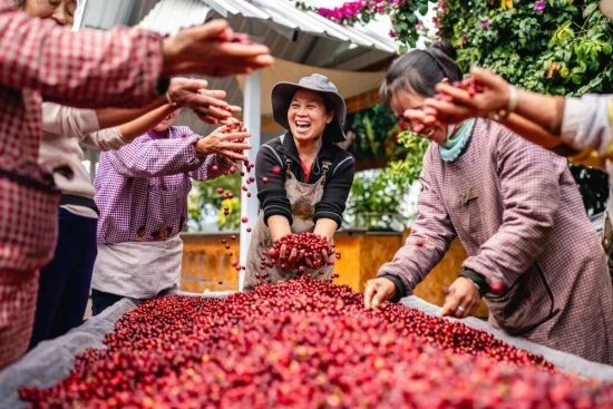 在普洱市思茅区天玉咖啡庄园,庄园经营者和工作人员庆祝咖啡丰收。胡超 摄