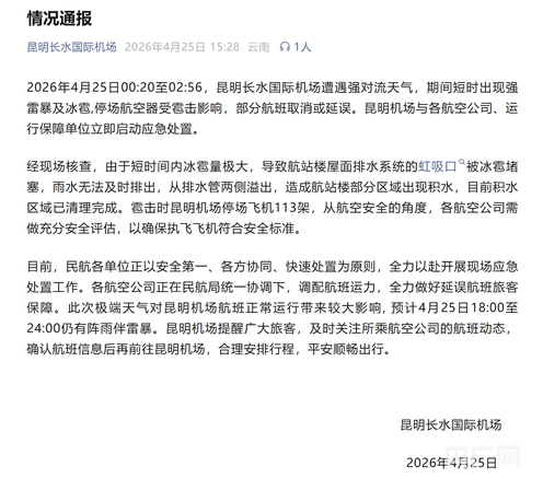 此外,预计4月25日18:00至24:00,昆明机场仍有阵雨伴雷暴,提醒广大旅客密切关注天气变化及所乘航班动态,合理安排出行计划。