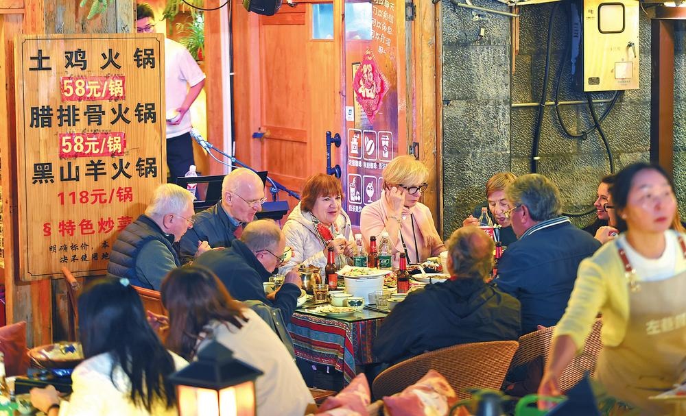 凭借优美风光、浓郁风情、独特文化体验和日趋完善的服务,丽江吸引众多外国游客前来体验“有一种叫云南的生活”。据丽江市公安局出入境管理支队统计数据,今年以来,全市临时入境人员达78.97万人次,同比增长47%。图为外国游客在丽江古城品尝美食。(记者 陈飞)