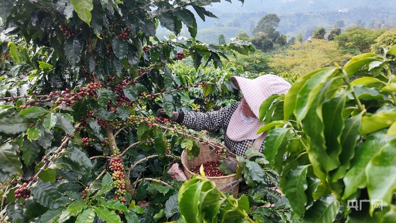 村民正在采摘咖啡豆(央广网实习记者 吴佳淇 摄)