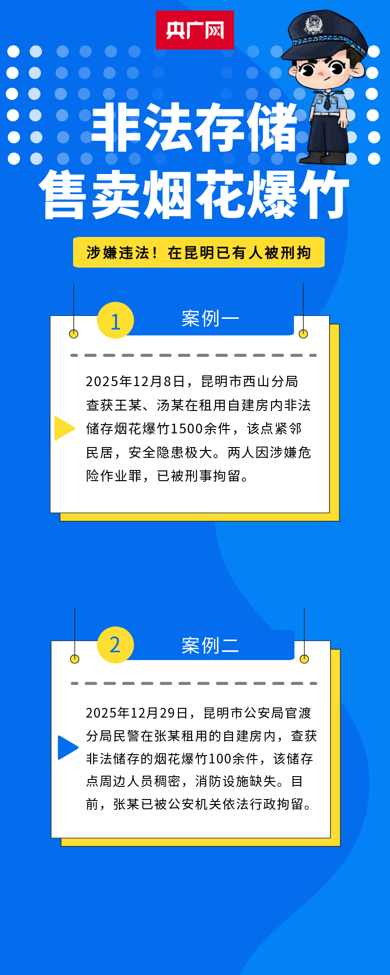 春节将至,烟花爆竹销售进入旺季,相关安全问题再次引发关注。近日,昆明警方查处了连续查处两起案件:西山分局查获居民区非法储销点,烟花爆竹堆满屋,两人因涉嫌危险作业罪被刑事拘留; 官渡分局查处一自建房违规储存点,周边人口密集、消防设施缺失,当事人被行政拘留。