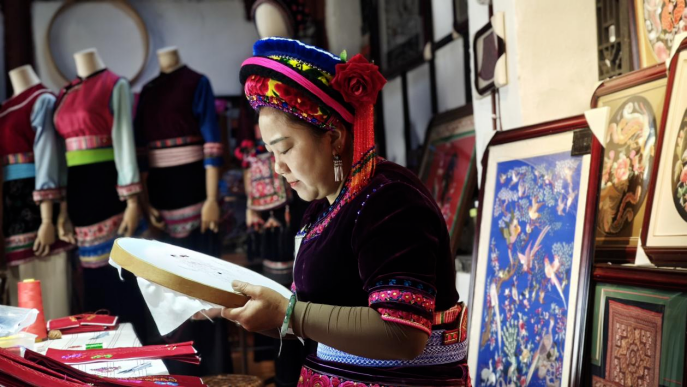 周城村地处大理市喜洲镇北部,有着“白族第一村”之称,99%的村民为白族,传统民居错落有致、民族文化传承完整。白族刺绣作为这里的“文化基因”,和周城村的“名片”扎染一样,早已融入当地人的生活。逢年过节、红白喜事,手工刺绣的服饰都是必不可少的“仪式感”。“以前家里儿子结婚,要给全家女眷都做一套手工服饰,几十年攒下来,很多家庭都有不少存货了。”杨美池说,随着时代变化,她也跟着调整思路,把部分服饰需求转化为更轻便装饰。