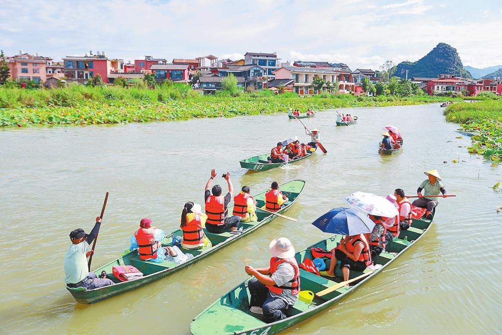 丘北县普者黑秋日美景吸引游客前来泛舟。记者 胡妤雅 摄