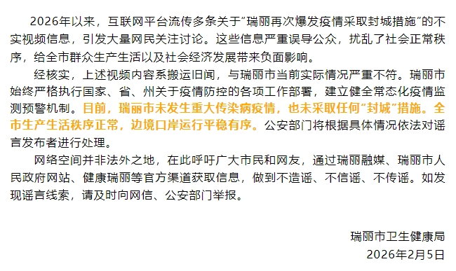 2026年以来,互联网平台流传多条关于“瑞丽再次爆发疫情采取封城措施”的不实视频信息,引发大量网民关注讨论。这些信息严重误导公众,扰乱了社会正常秩序,给全市群众生产生活以及社会经济发展带来负面影响。