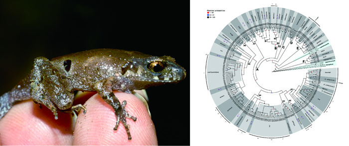 掌突蟾属物种体型小型化,形态保守(左);掌突蟾属物种系统发育,显示存在较高的隐存多样性(右)。图片来自Jodi Rowley和Chen et al. (2018)。