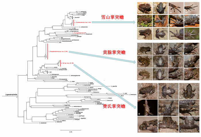 总体上,通过该研究进一步确定,地方特有种和同域物种分布是掌突蟾属物种的常见分化模式。比如,在小桥沟自然保护区同域共存4种掌突蟾属物种,包括两个新种(黄腺掌突蟾和费氏掌突蟾)和两个中国新纪录(布氏掌突蟾和夜神掌突蟾)。如此高的近缘物种如何在此区域实现共存,这一现象背后的机制问题值得进一步研究。