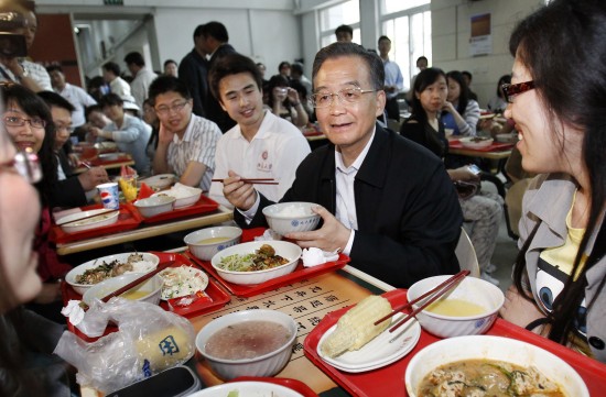 温家宝在北大学一食堂与同学们共进午餐。新华社记者 刘建生 摄